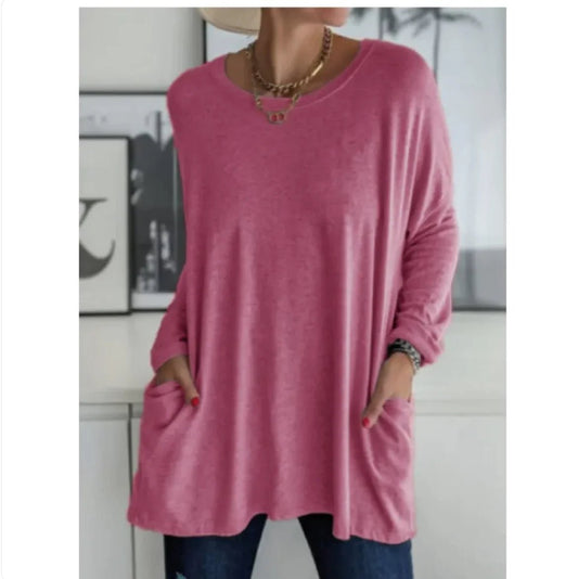 Loose Fit Long Sleeve Round Neck Top with Pockets